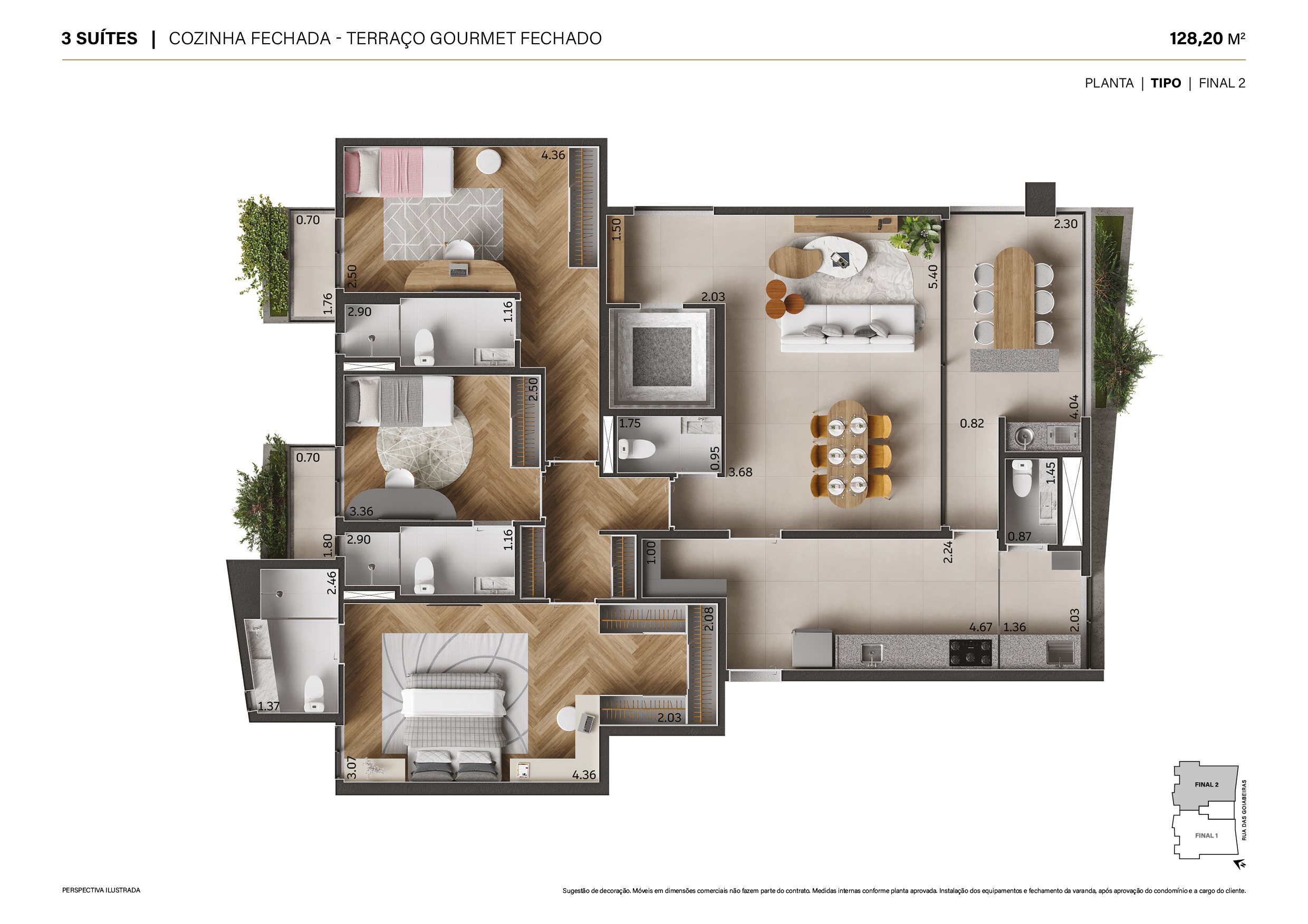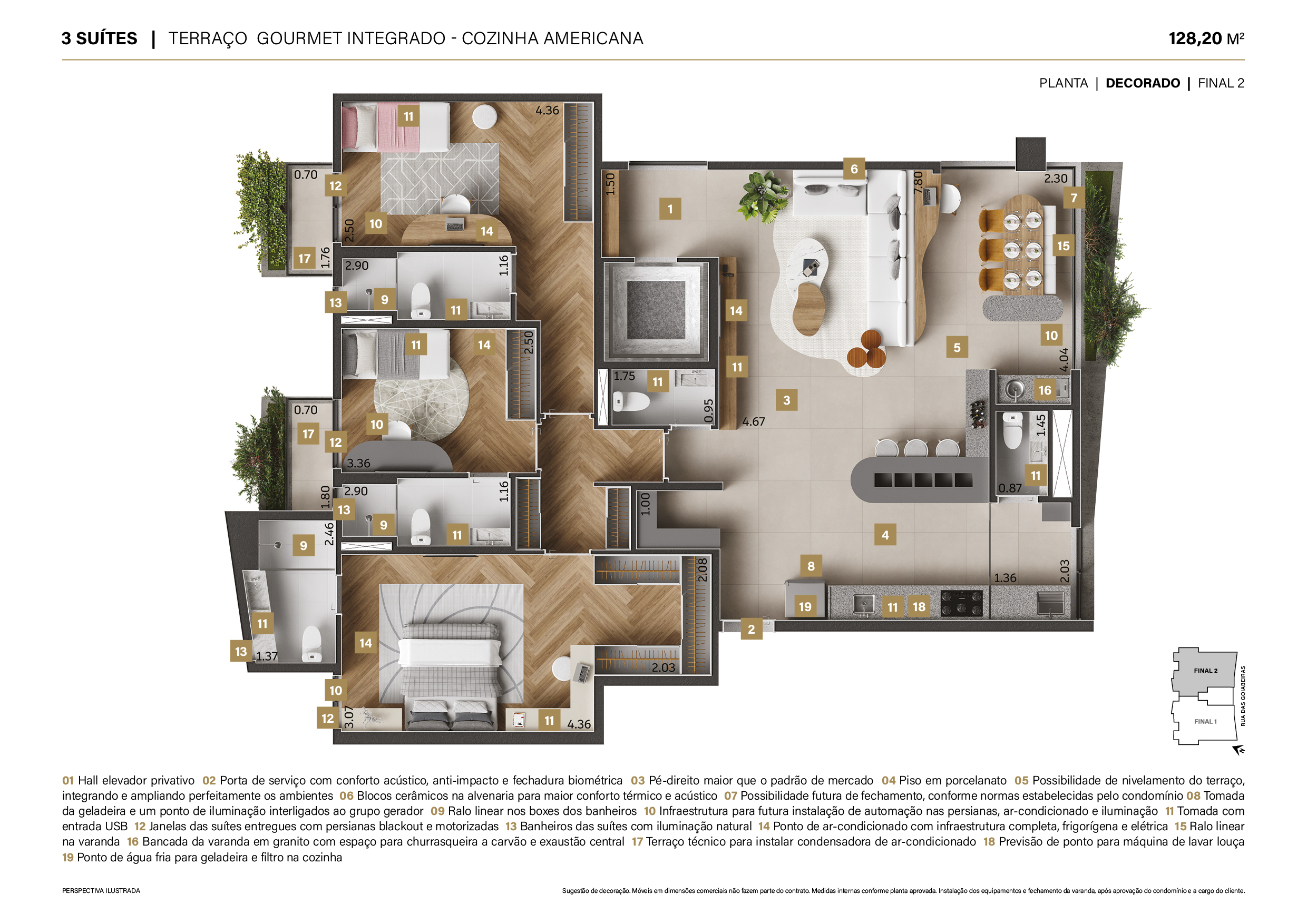 Todas as unidades possuem 3 suítes com 128m², 3 vagas de garagens determinadas e livres. As rampas de acesso são niveladas para carros baixos. Além disso, o projeto apresenta duas coberturas com 226m² e 4 vagas.